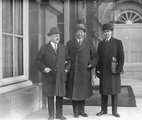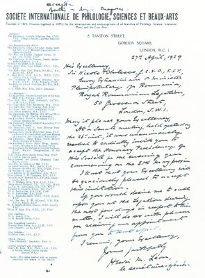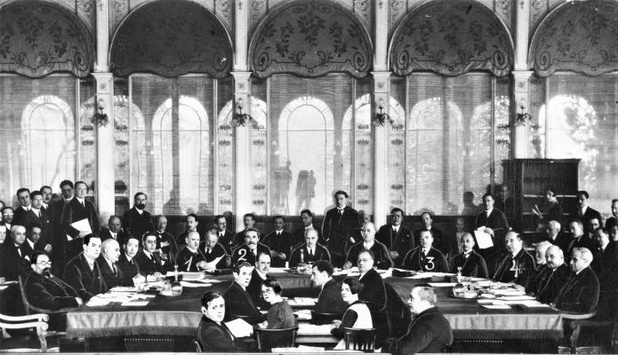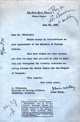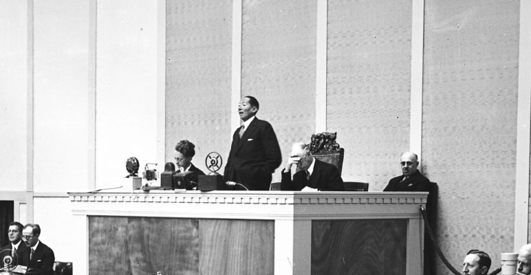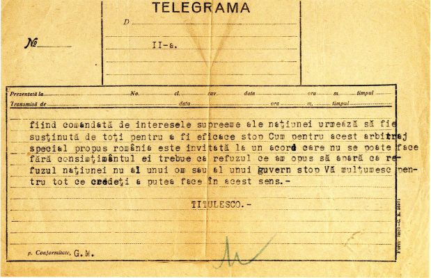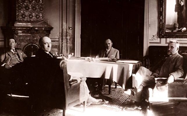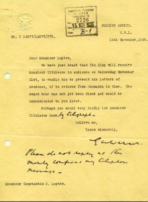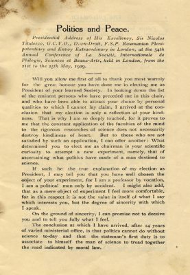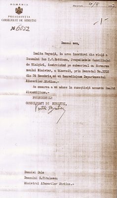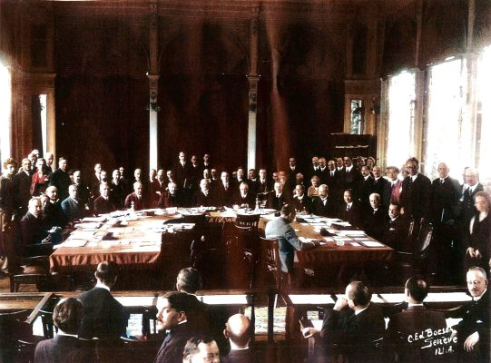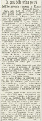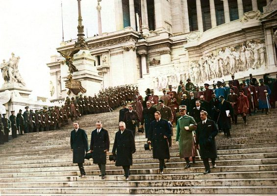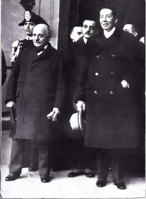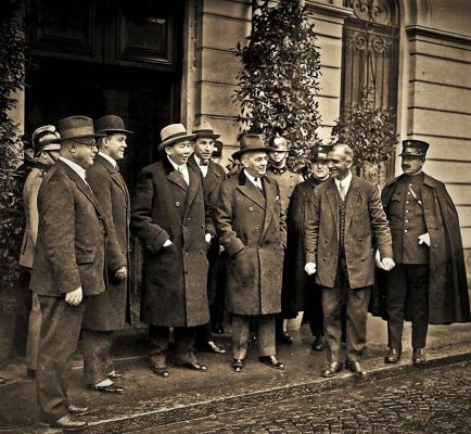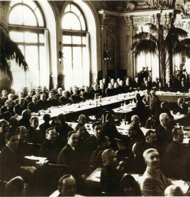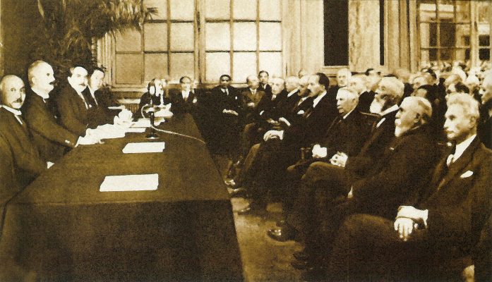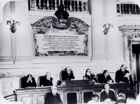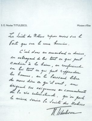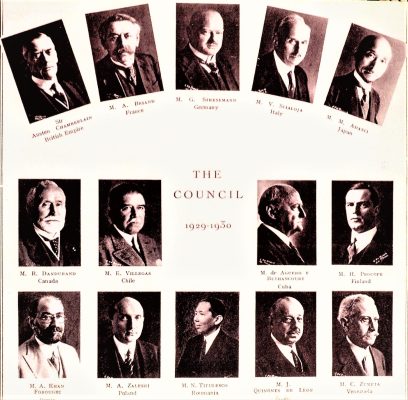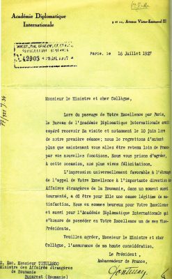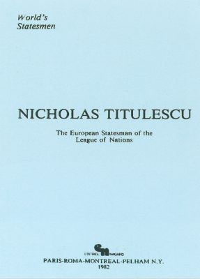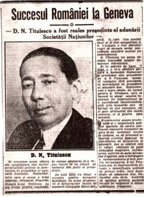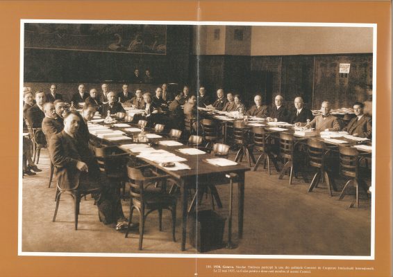 27 octombrie 1930, Institutul Internaţional de Agricultură (Villa Umberto), Roma. Deschiderea lucrărilor celei de-a XX-a sesiuni a Academiei Diplomatice Internaţionale. Nicolae Titulescu, unul dintre membri fondatori, a fost ales vicepreşedinte în 1927 şi va deveni preşedinte în 1934. La 15 martie 1929, diplomatul român a prezentat comunicarea Societatea Națiunilor şi minorităţile. În imagine, în prezidiu alături de vicontele Joseph de Fontenay, preşedintele Academiei, Prosper Poullet, fost Premier al Belgiei, Vittorio Scialoja, Ministru de Stat (Italia) şi Antonios Frangoulis (Grecia), Secretar General permanent al Academiei.